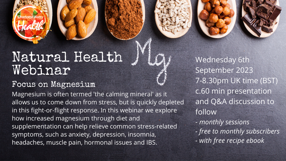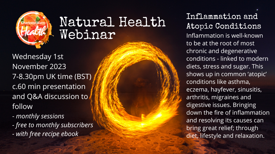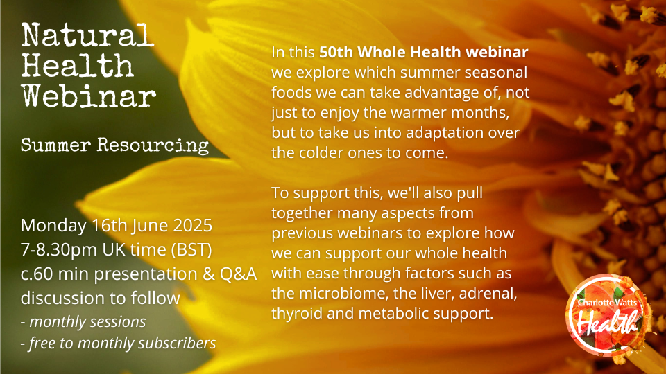 These Natural Health Webinars are free to monthly subscribers in Charlotte's online class monthly membership – you will receive information and access prior to the webinar with your class links for the same week; also access to recording within the subscription portal.