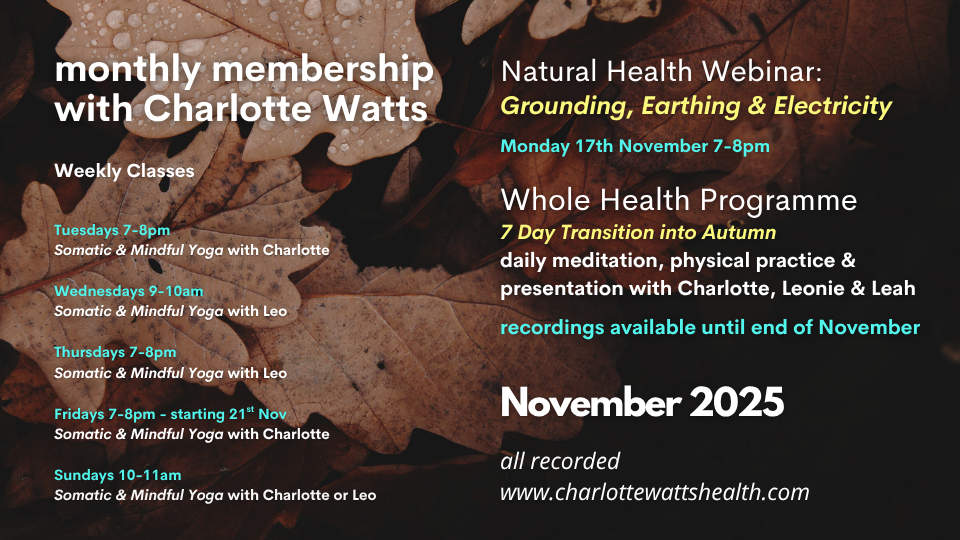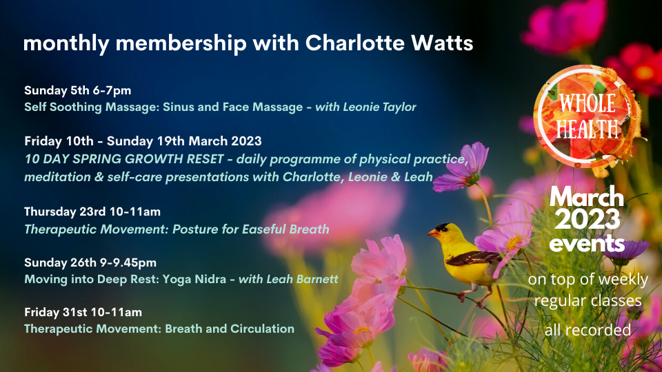 Charlotte is joined within the Whole Health offerings by similarly experienced teachers Leonie Taylor and Leah Barnett; both of whom she has worked with for many years and who bring their own voices and specialisms along. This creates a timetable over each week that offers a complementary rhythm of differing ways of tuning into and caring for our whole being; body and mind.